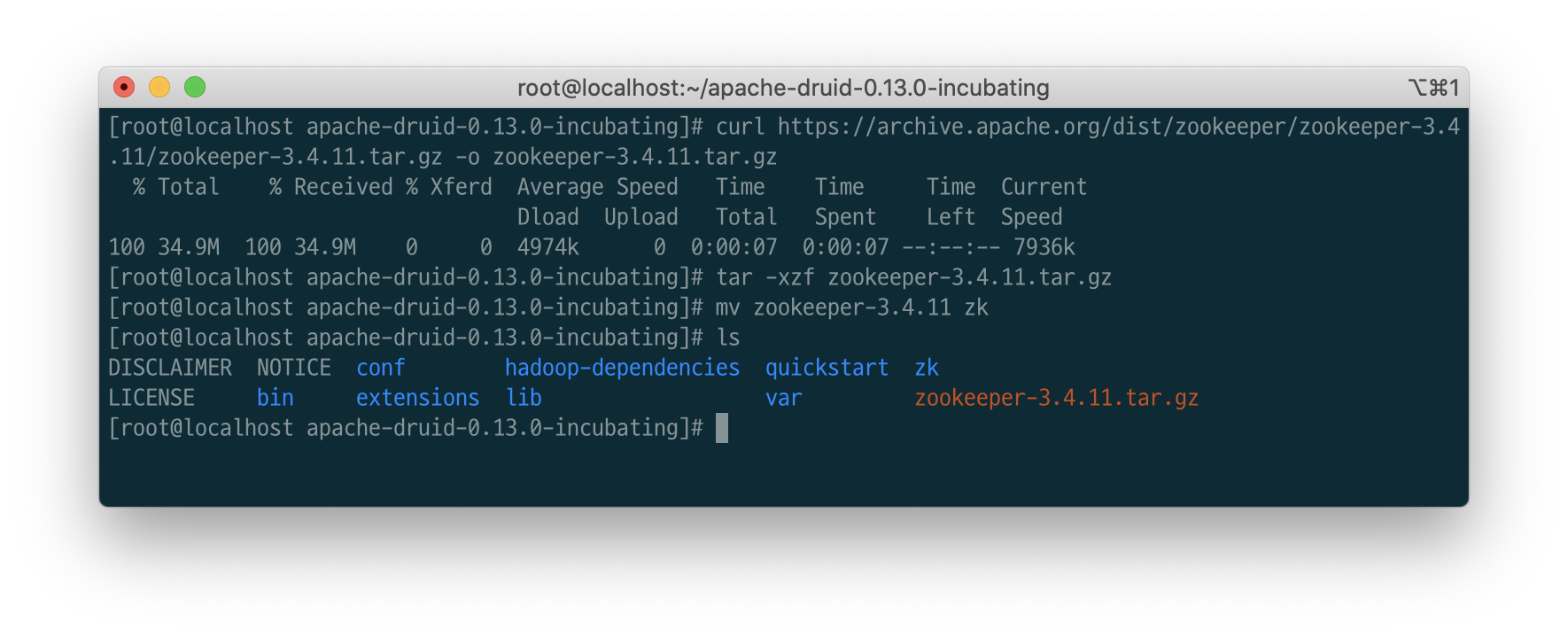 $ wget https://archive.apache.org/dist/incubator/druid/0.13.0-incubating/apache-druid-0.13.0-incubating-bin.tar.gz