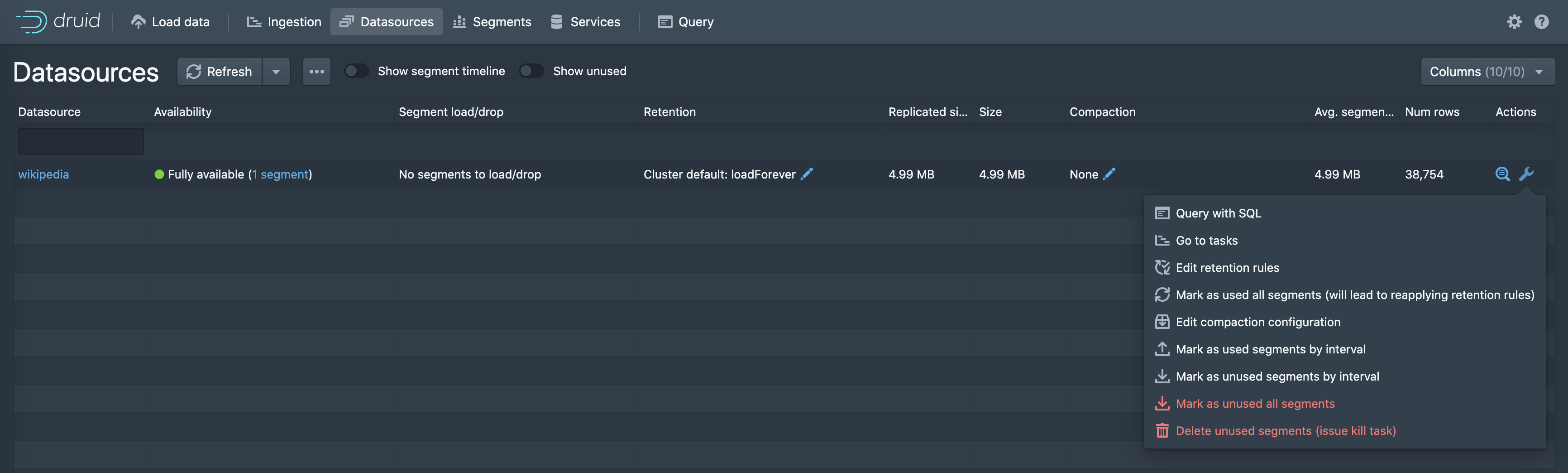 data ingestion이 Running -> Success로 변하면 상단 메뉴바의 [datasources] -> 오른쪽 랜치모양 아이콘 클릭